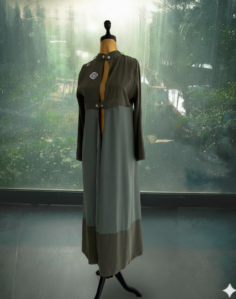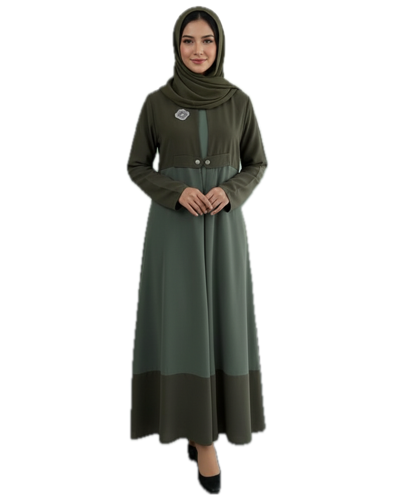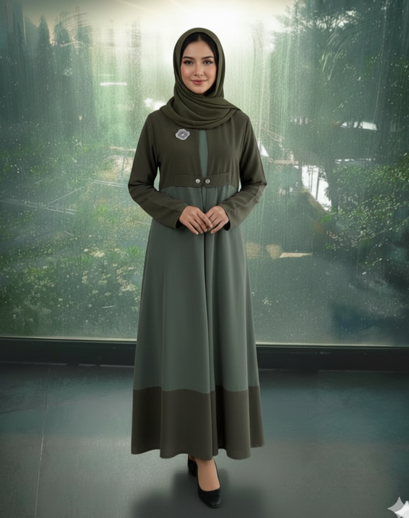 Erleben Sie, wie stilvolle Zurückhaltung auf modernes Design trifft. Dieses elegante Kleid in zwei harmonischen Olivtönen ist die perfekte Wahl für die Frau, die Präsenz zeigt, ohne aufdringlich zu sein.