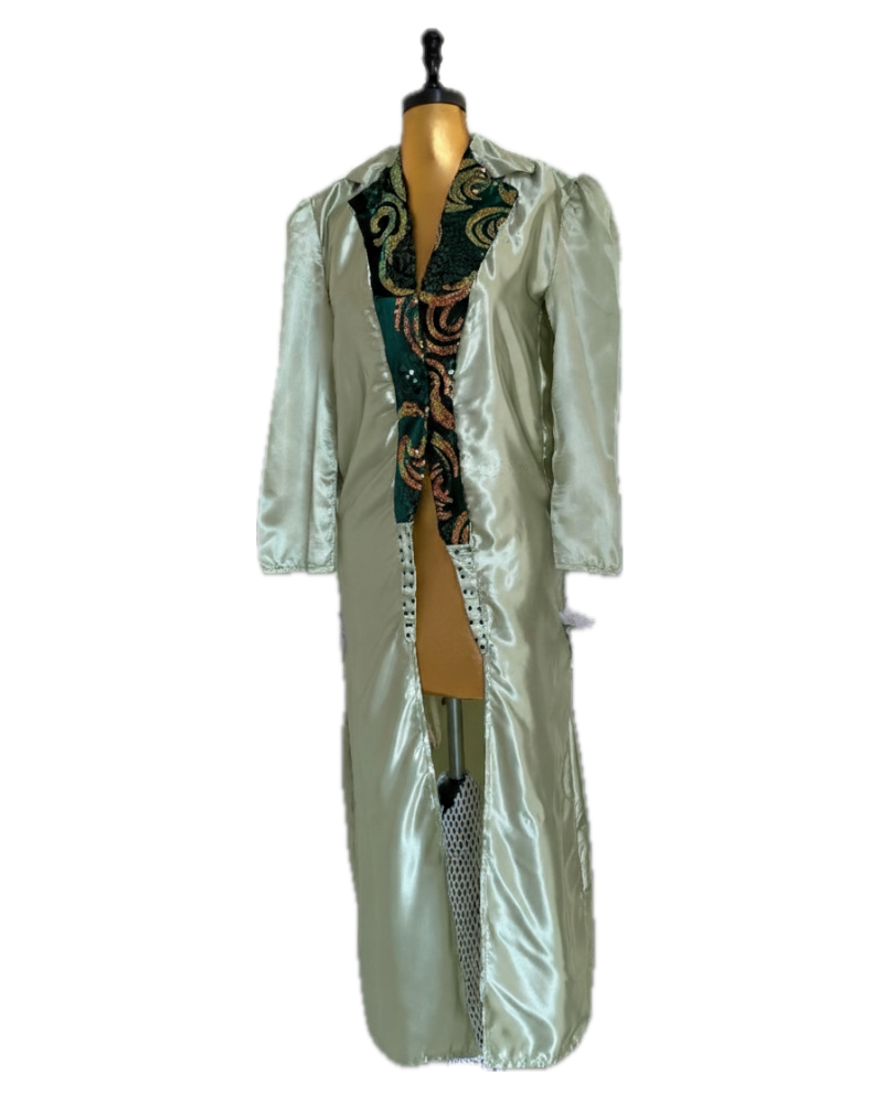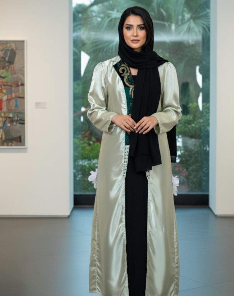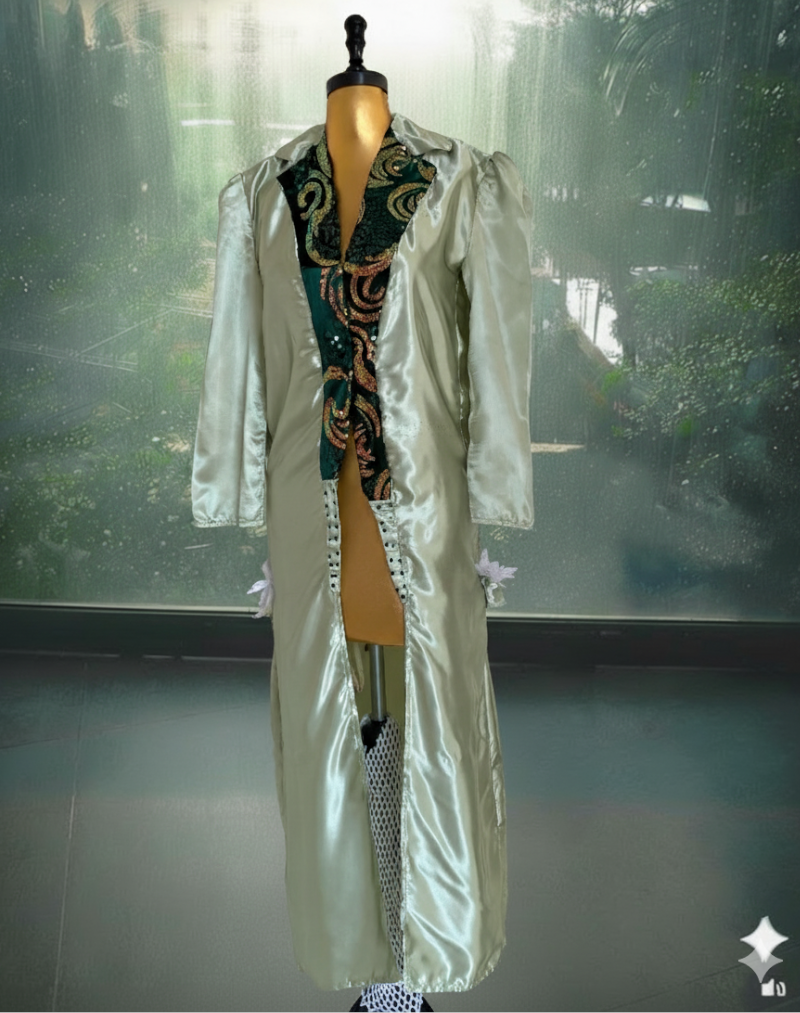 Erleben Sie den Wow-Moment. Dieser Mantel aus edlem, schimmerndem Material zieht sofort alle Blicke auf sich. Der helle, fast perlmuttartige Ton in Kombination mit dem tiefen Schwarz des Unterkleides schafft einen dynamischen Kontrast. Perfekt für besondere Anlässe, bei denen Sie strahlen möchten. Ein Kleidungsstück, das Luxus und Klasseverkörpert. Sichern Sie sich Ihr Glanzstück!