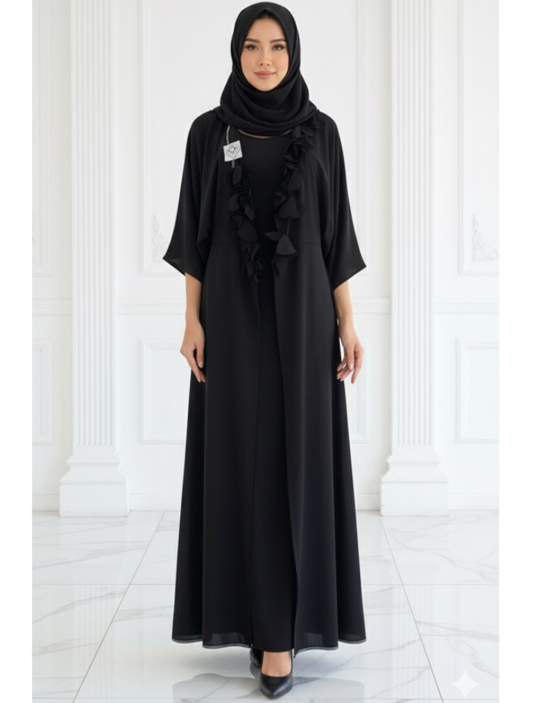 Diese edle schwarze Abaya vereint klassisches Design mit einem raffinierten Detail. Ein stilvolles Ensemble, das Ihren Look bei jedem Anlass aufwertet und Ihre Persönlichkeit unterstreicht.