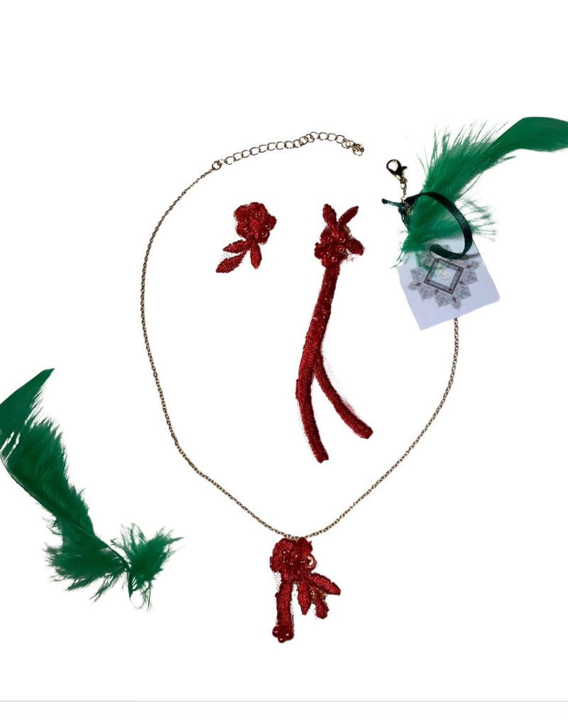 Ein Set, das Leidenschaft weckt und Blicke fängt. Dieses 2-teilige Schmuck-Ensemble in intensivem rot ist Ihr Schlüssel zu einem unvergesslichen Auftritt. Die texturierte, rote Struktur von Anhänger und Ohrringen, kombiniert mit frechen, grünen Feder-Akzenten, garantiert einen starken, glamourösen Look. Tragen Sie es, wenn Sie Selbstvertrauen ausstrahlen und beeindrucken wollen. Limitierte Kollektion – Sichern Sie sich Ihr Statement