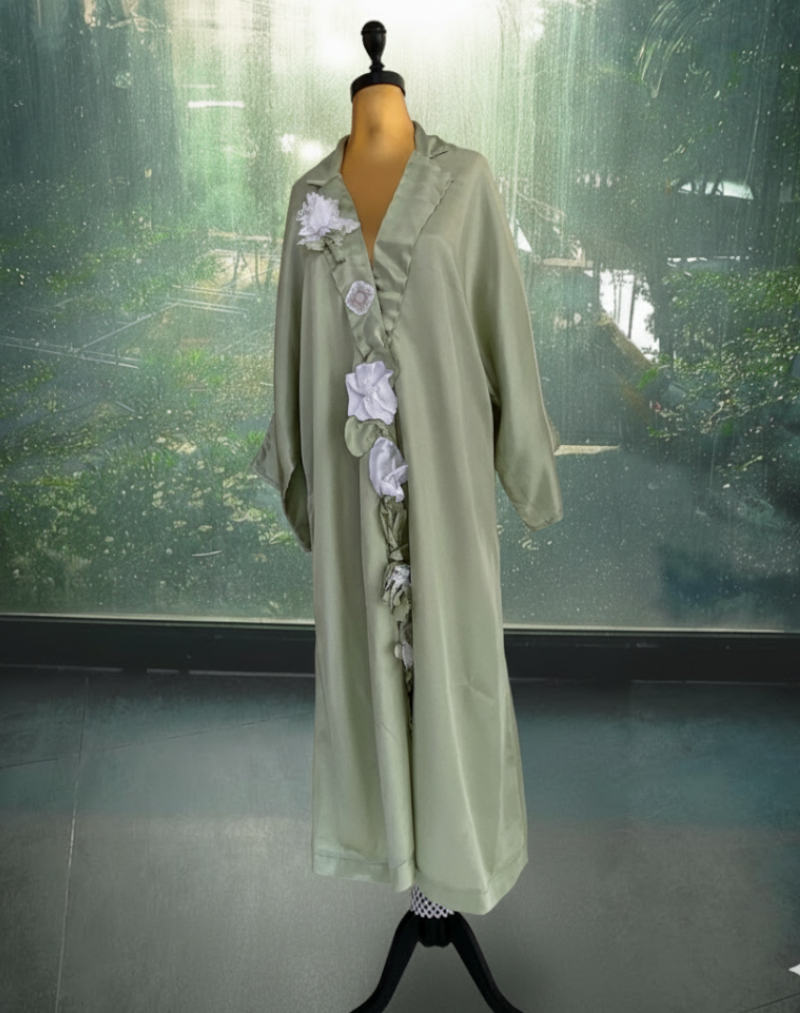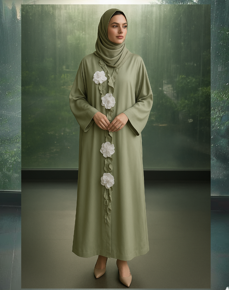 Diese stilvolle muslimische Abaya vereint Anmut, Modernität und Tradition in einem harmonischen Design. Das sanfte Grün vermittelt Ruhe und Natürlichkeit, während die kunstvoll gearbeiteten weißen Blüten entlang der Vorderseite einen Hauch von femininer Eleganz verleihen.