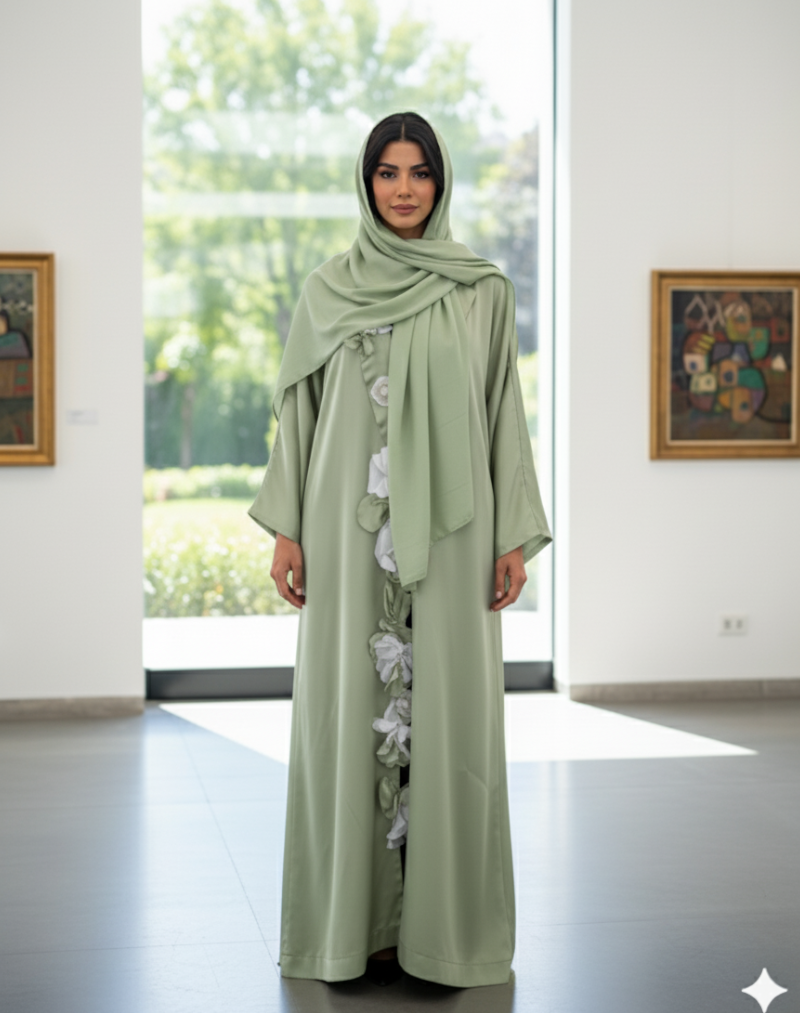 Elegante muslimische Abaya in zartem Grün mit weißen Blütendetails – stilvoll, bequem und perfekt für Alltag oder festliche Momente.