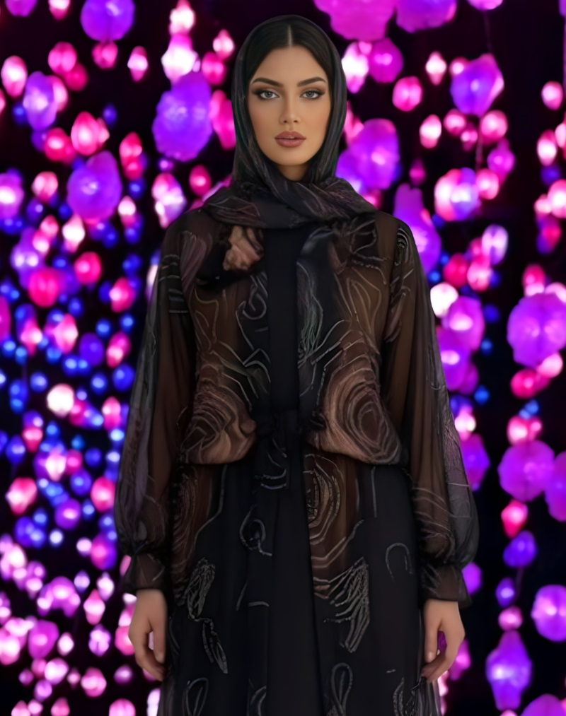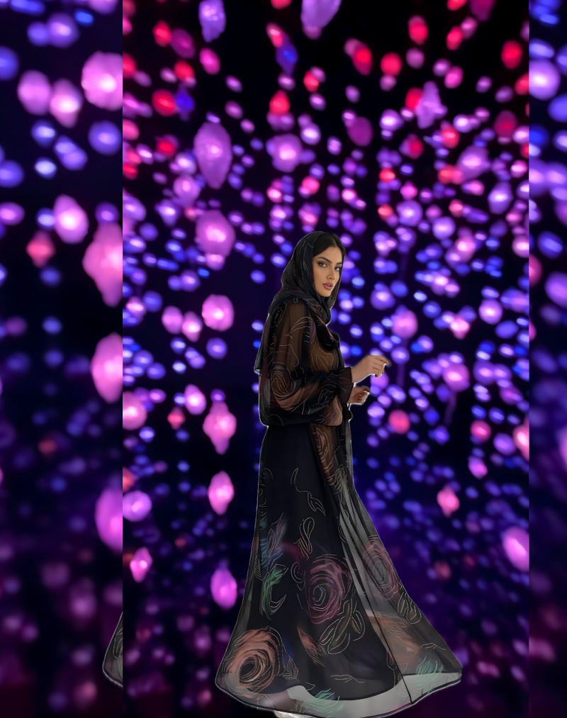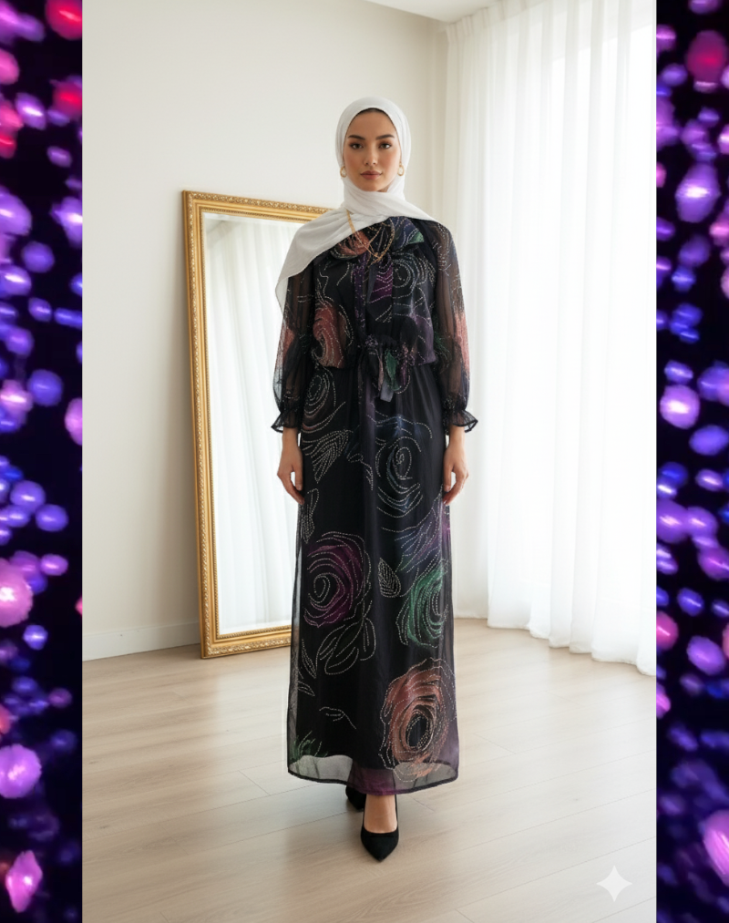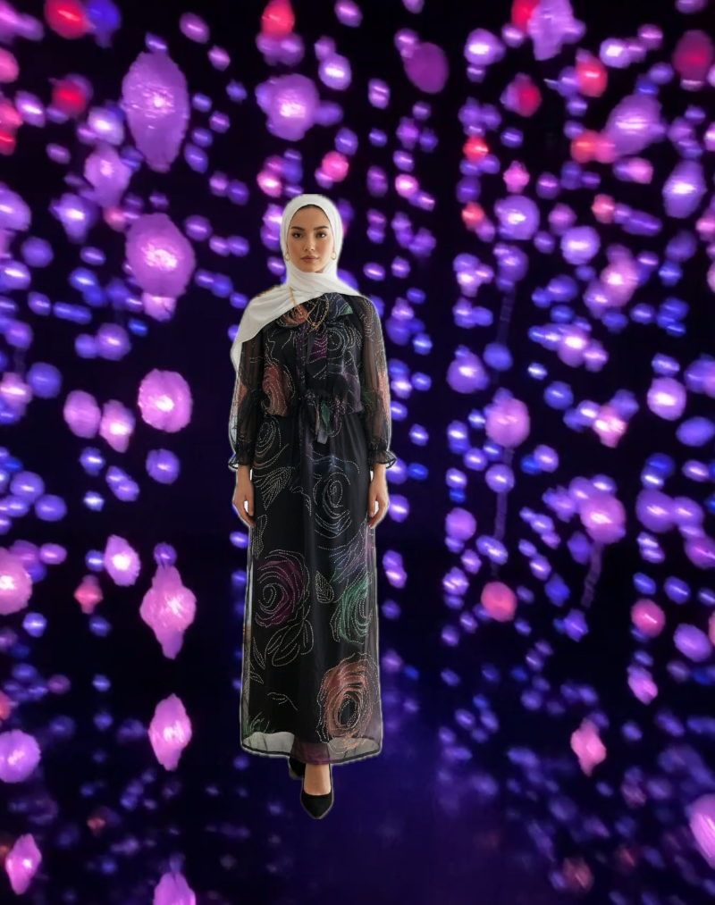 • Einzigartiges Design, das fesselt: Das tiefschwarze Material bildet die ideale Bühne für das aufwendige, leuchtende Blumen- und Lichtmuster, das dem Kleid eine fesselnde Tiefe verleiht.