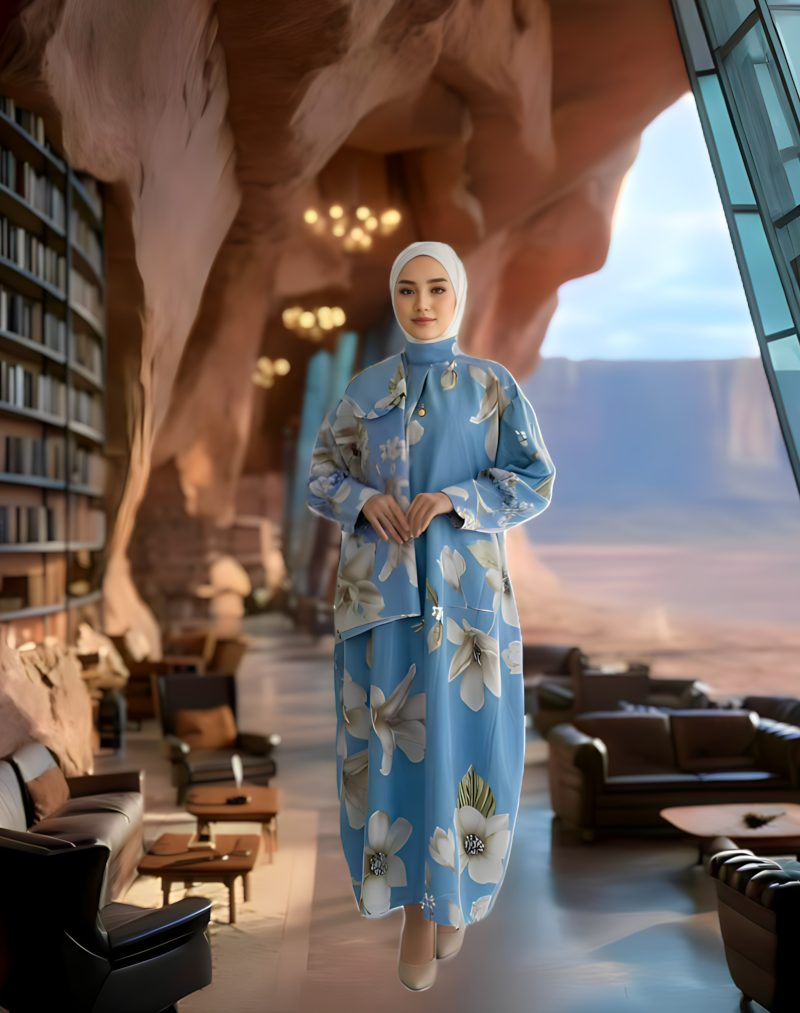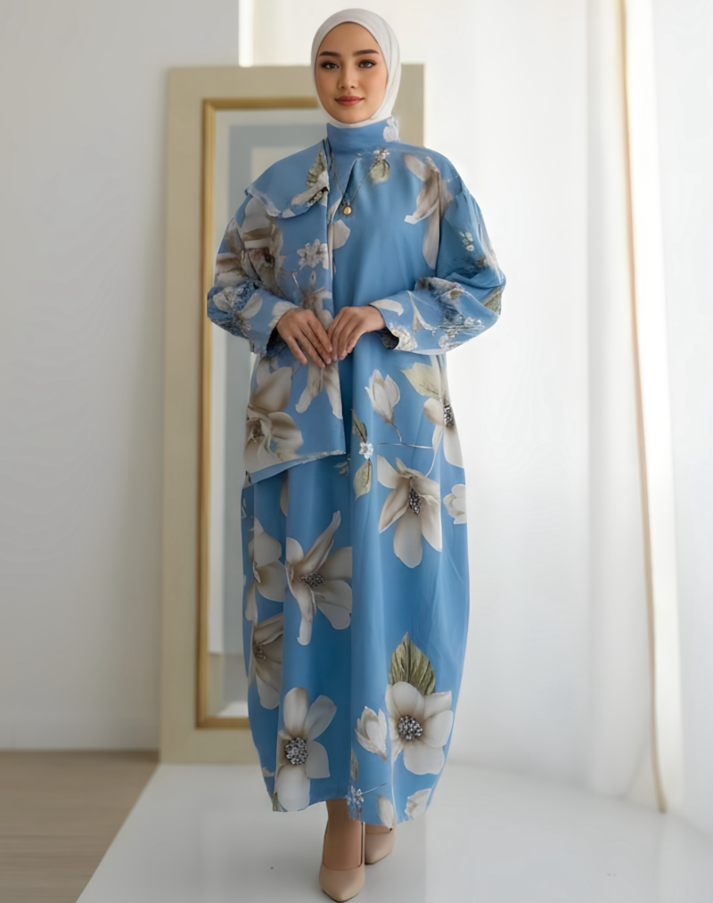Tauchen Sie ein in die Schönheit der Natur, eingefangen in diesem atembeaubenden, fließenden Kleid. Das himmlische Blau des Stoffes wird von geschmackvollen, hellbraunen Blütenverziert, die eine harmonische Ruhe ausstrahlen. Dieses Kleidungsstück ist mehr als nur Mode; es ist ein Gefühl von Anmut und Leichtigkeit für jede Gelegenheit. Ob beim festlichen Besuch, einem wichtigen Termin oder im entspannten Alltag – es bietet Ihnen einen stilvollen, bedeckten Look, der Ihre Persönlichkeit elegant unterstreicht. Spüren Sie die Verbindung zur Natur und genießen Sie den außergewöhnlichen Tragekomfort des weichen Materials, das Sie den ganzen Tag begleitet.