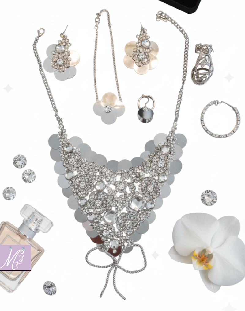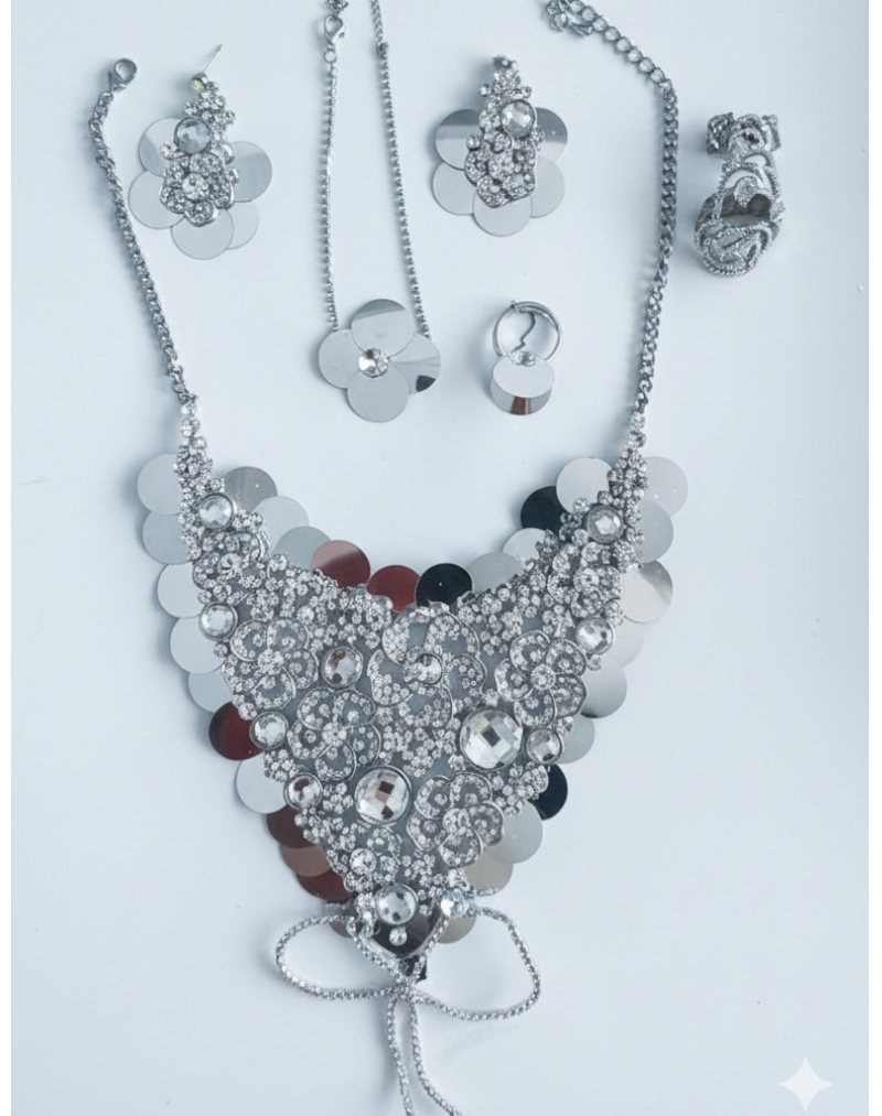 HAND MADE BY NZIK OMAR, Das 4-teilige Kristallschmuck-Set bietet ein harmonisch abgestimmtes aus Collier, Ohrringen, Ring und Armband, das sofort ins Auge fällt. Die vielen klaren Kristalle erzeugen ein intensives Funkeln, das jedes Outfit aufwertet. Die hochwertigen Metall- und Glanzdetails sorgen für eine edle, moderne Ausstrahlung. Perfekt für Feste, Abendlooks oder als besonderes Geschenk.