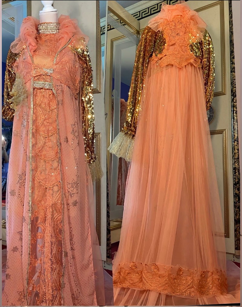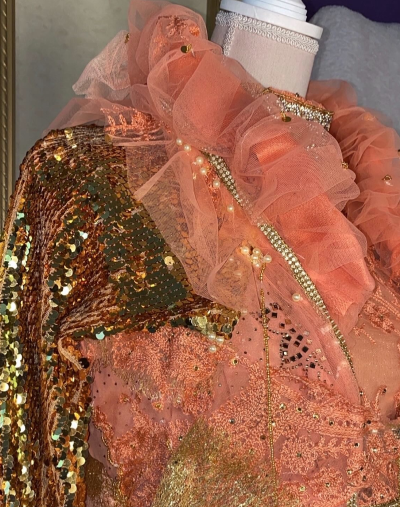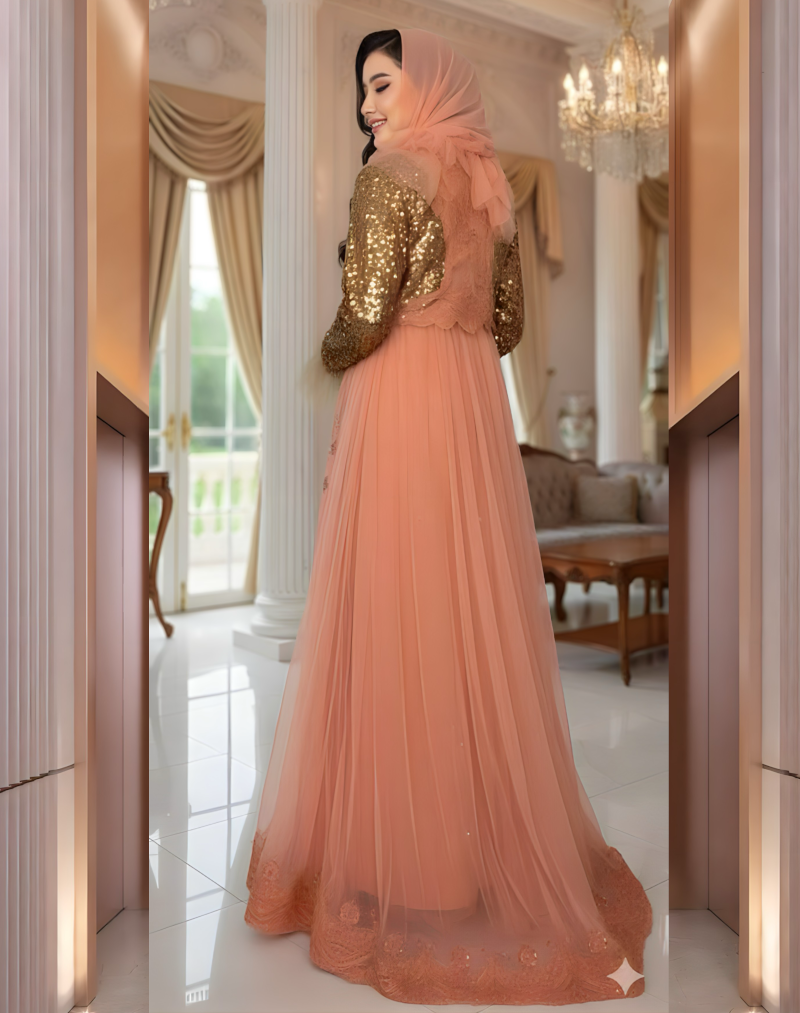 Ein atemberaubendes Kleid in zartem Pfirsichton, veredelt mit funkelnden Pailletten und feinsten Blumen-Details. Perfekt für Hochzeiten, Galas und besondere Anlässe, um alle Blicke auf sich zu ziehenEin majestätisches Abendkleid in edlem Altrosa, kombiniert mit einem kunstvollen Überwurf aus goldbestickter Spitze. Perfekt für Hochzeiten und feierliche Anlässe, das die Schönheit der kurdischen Mode feiert.