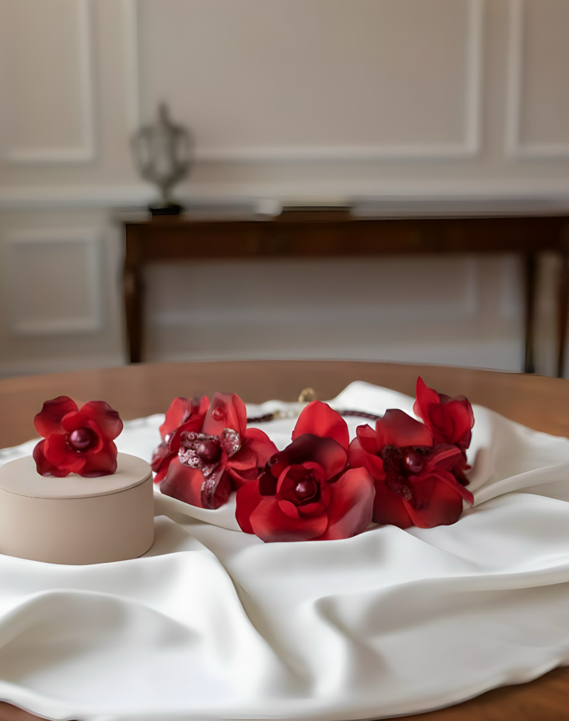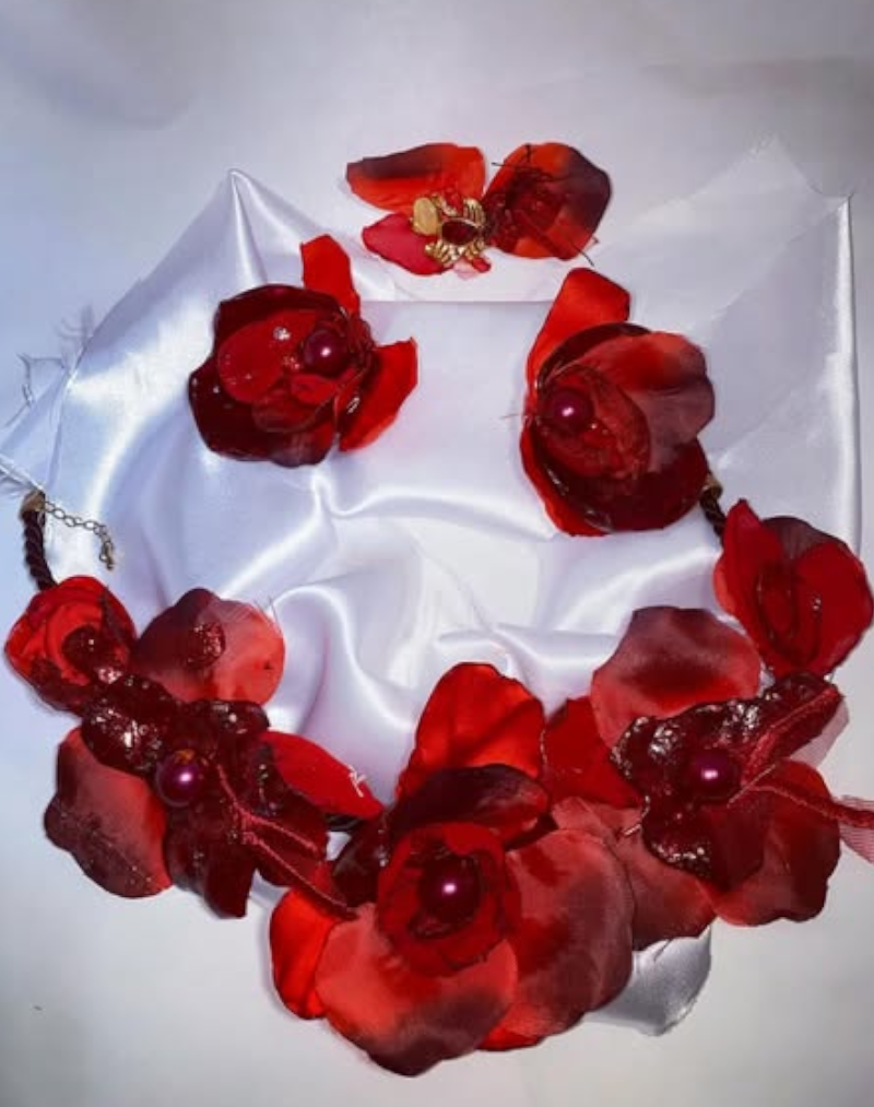 - Feuerrote Blüten: Im Zentrum stehen filigrane, tiefrote Rosenblüten, gefertigt aus leuchtendem Kristall. Ihre intensive Farbe symbolisiert Liebe, Mut und tiefe Zuneigung. Sie sind kunstvoll arrangiert, um wie ein luxuriöser, blühender Kranz um das Dekolleté zu liegen.