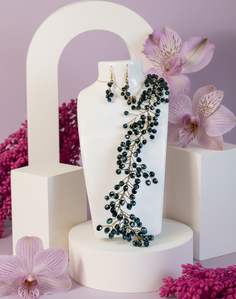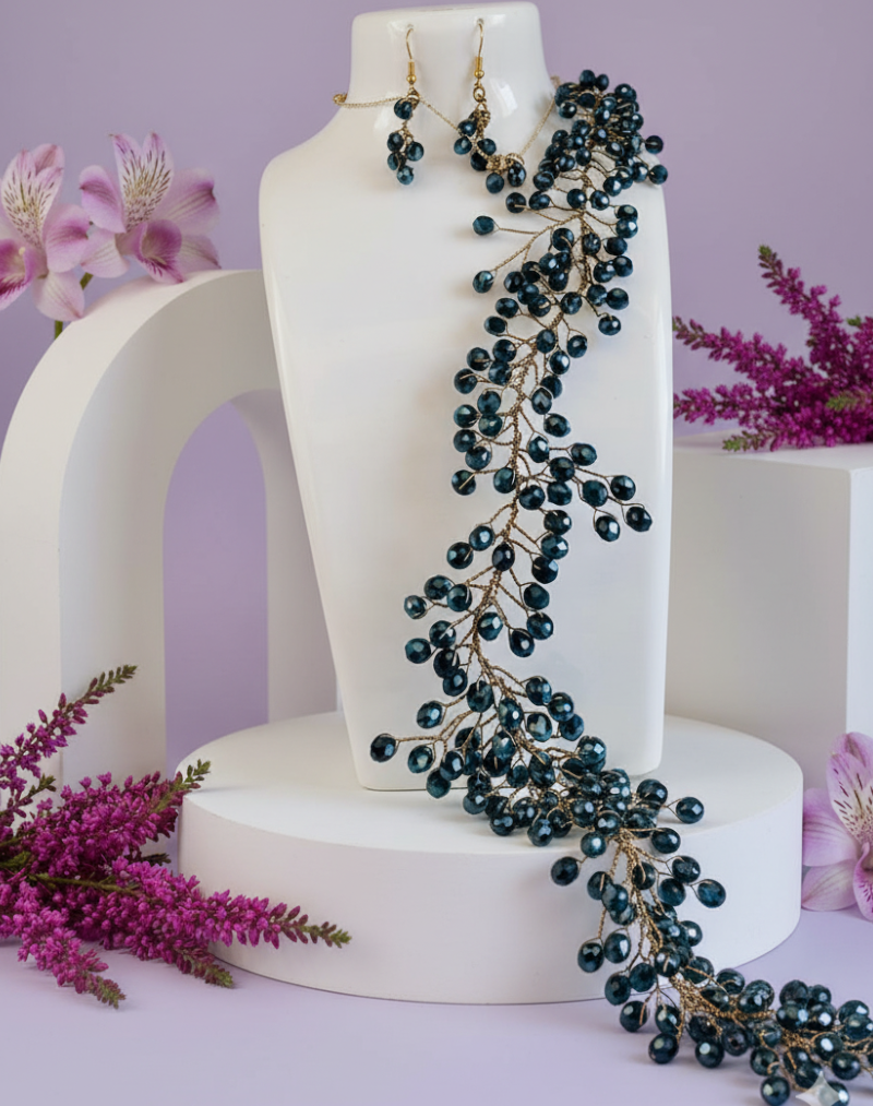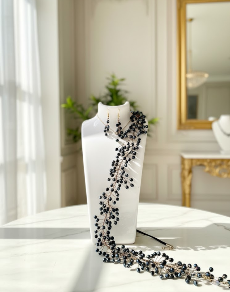 Jedes Stück ist ein Ausdruck von Stil und Anmut: Die tief glänzenden Kristalle reflektieren das Licht auf faszinierende Weise und verleihen jedem Look eine edle Note. Die feinen Verzweigungen erinnern an zarte Blütenranken und unterstreichen die feminine Ausstrahlung ihrer Trägerin.