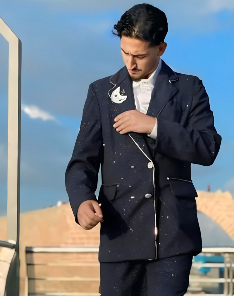 Dieser exklusive Herrenanzug vereint klassische Eleganz mit einem modernen, edlen Touch. Das dunkelblaue Stoffdesign mit feinem Glitzer-Effekt fängt das Licht dezent ein und sorgt für einen stilvollen Auftritt – sei es bei einer Hochzeit, einer Abendveranstaltung oder einem geschäftlichen Anlass. Das schneeweiße Hemd bildet den perfekten Kontrast und verleiht dem Outfit zusätzliche Raffinesse. Die hochwertige Verarbeitung und die sorgfältig abgestimmten Details machen diesen Anzug zu einer Wahl für Männer, die Wert auf Eleganz, Komfort und Ausstrahlung legen